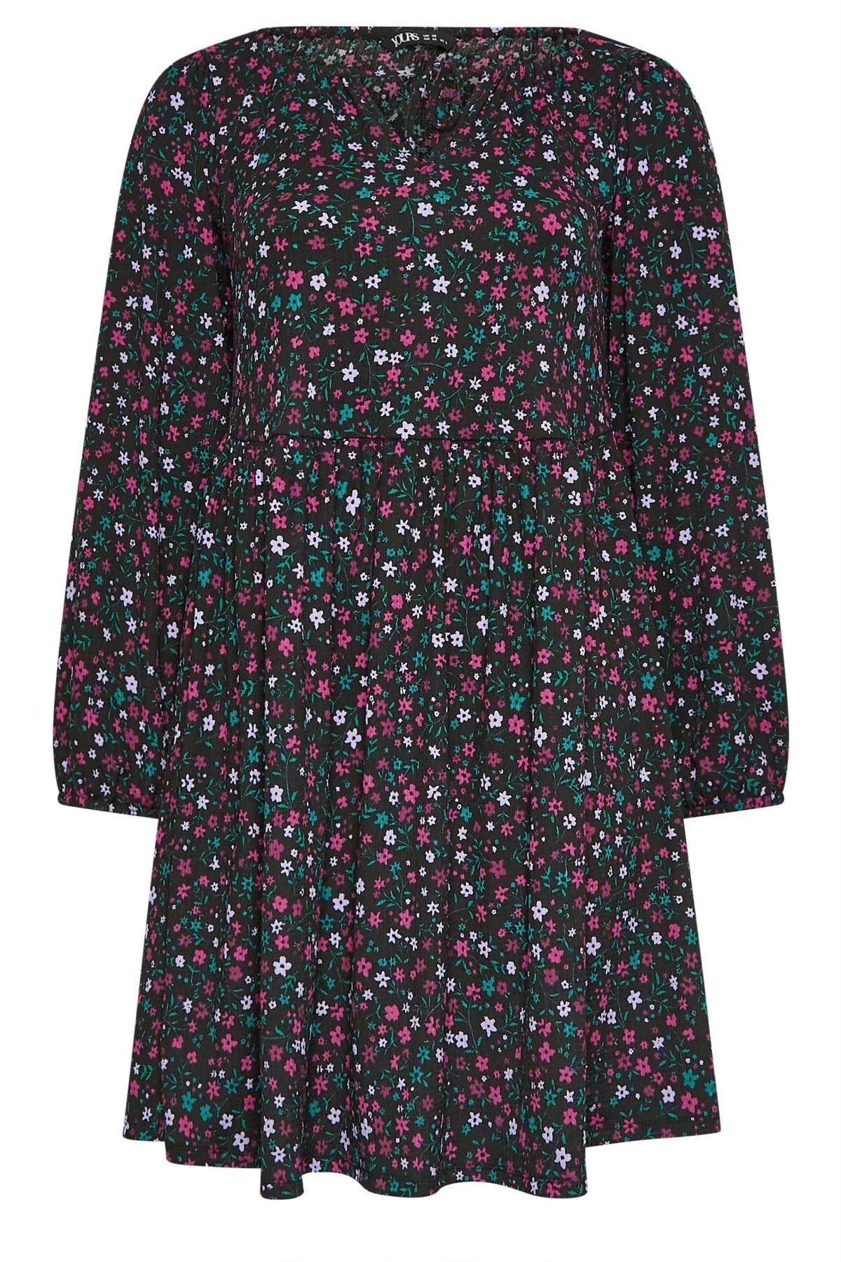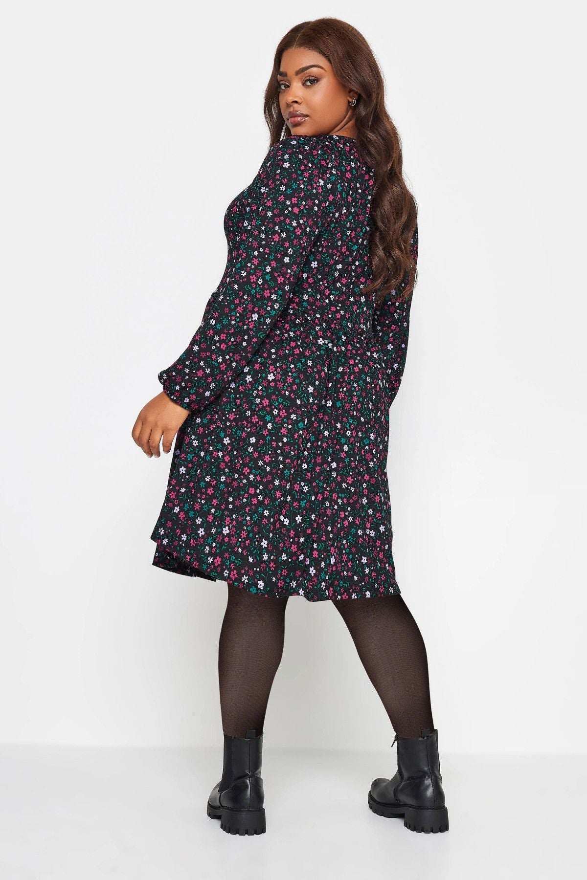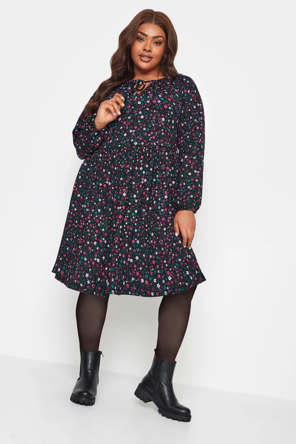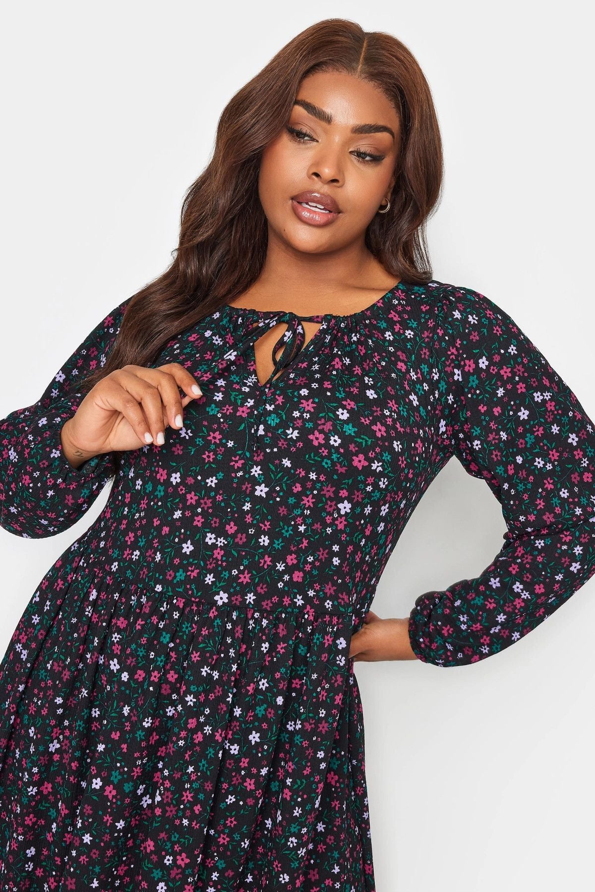Büyük Beden Yakası Bağlama Detaylı Çiçek Desenli Midi Boy Elbise 137628