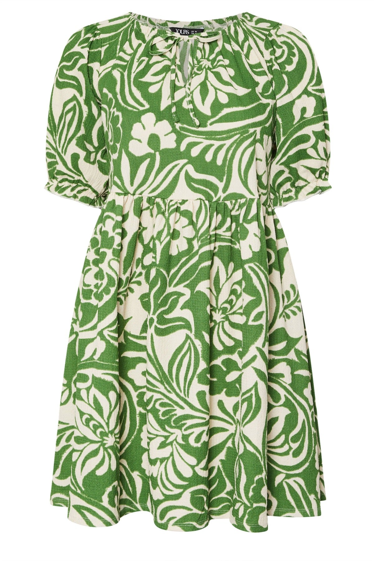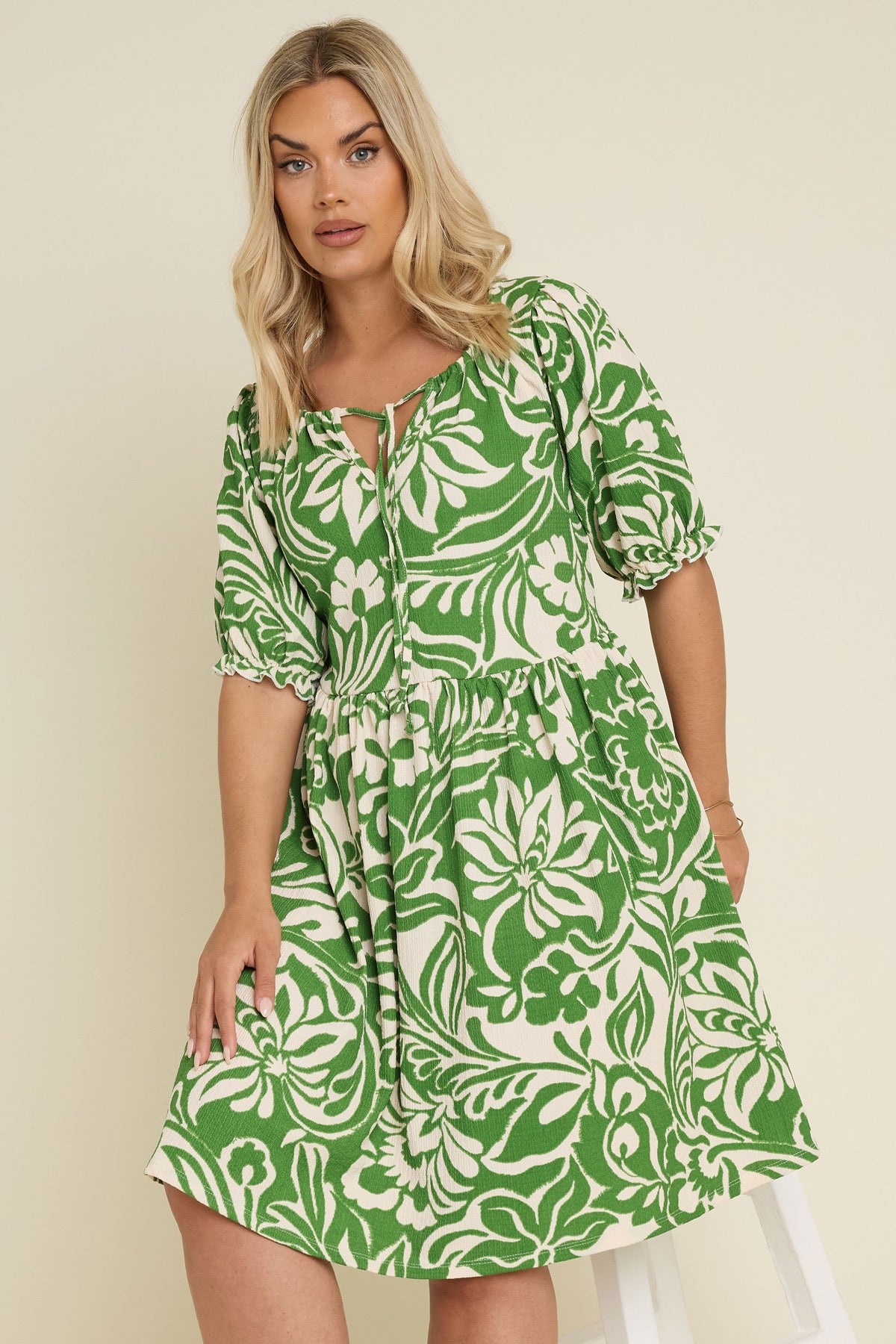 Model Detayı: Soyut desenli, bağlamalı yaka, kısa kollu, midi boy