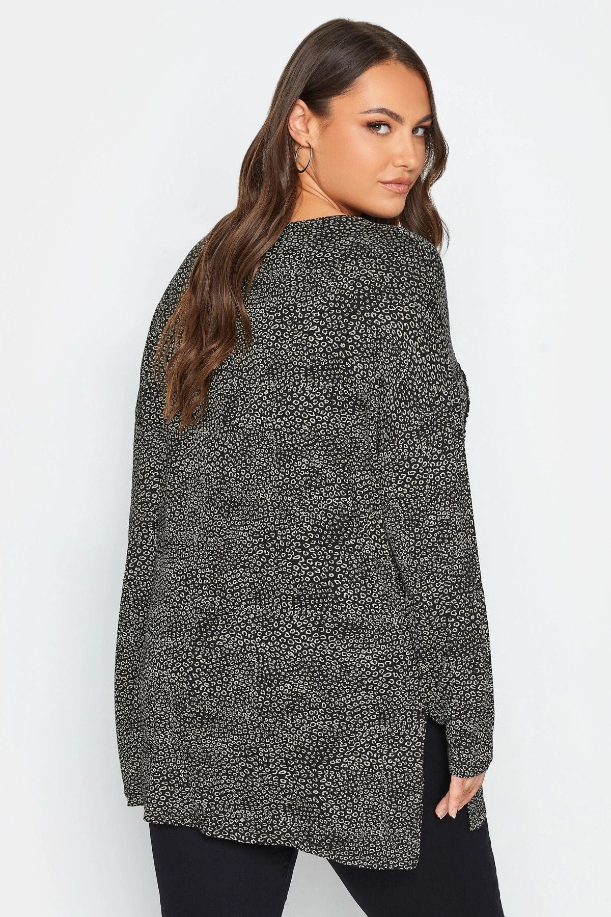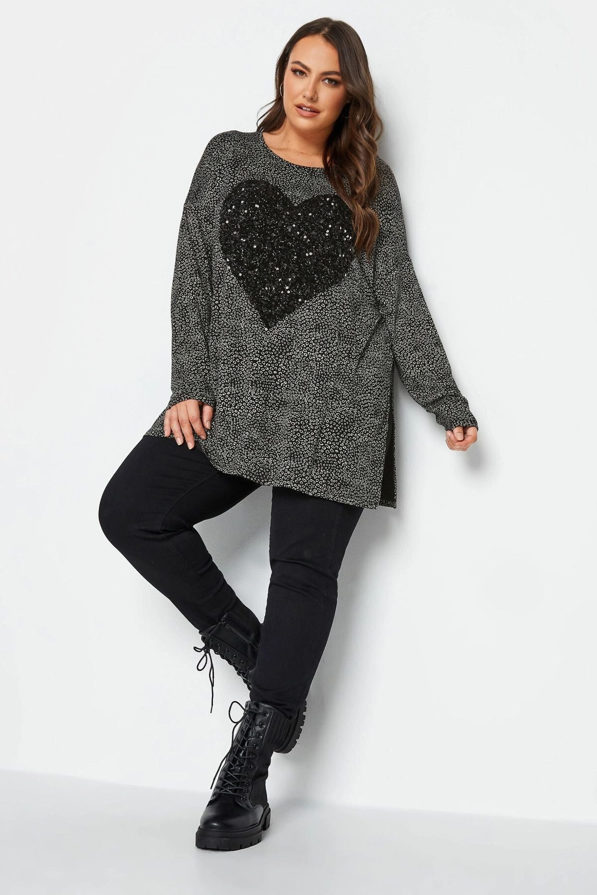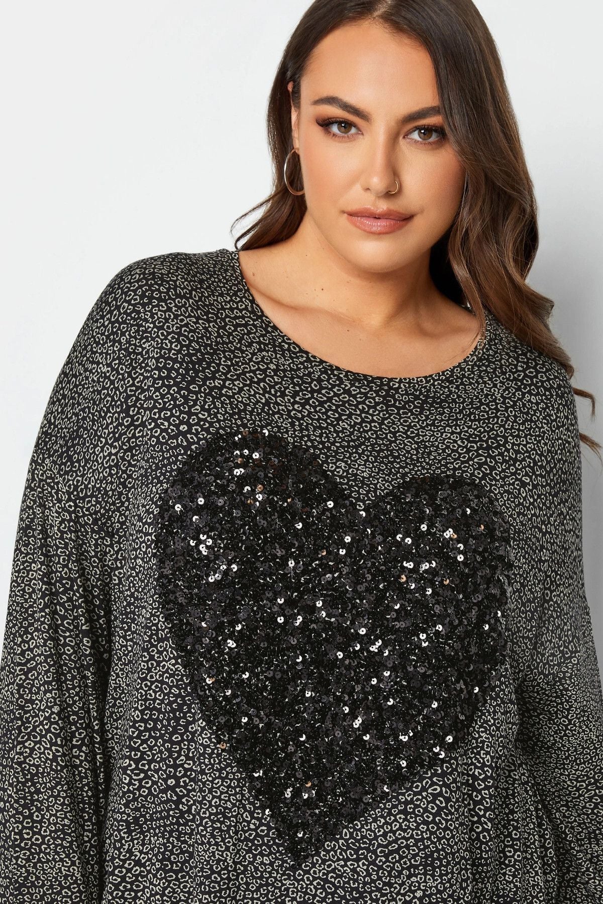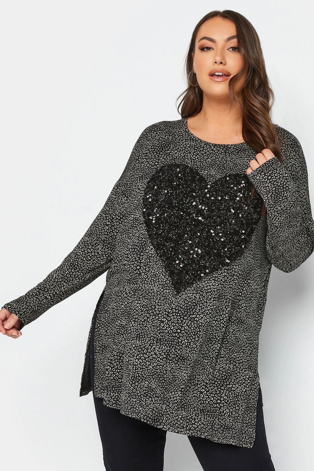 Büyük Beden Yırtmaç Detaylı Puantiyeli Payetli Uzun Kollu Bisiklet Yaka Bluz 302497