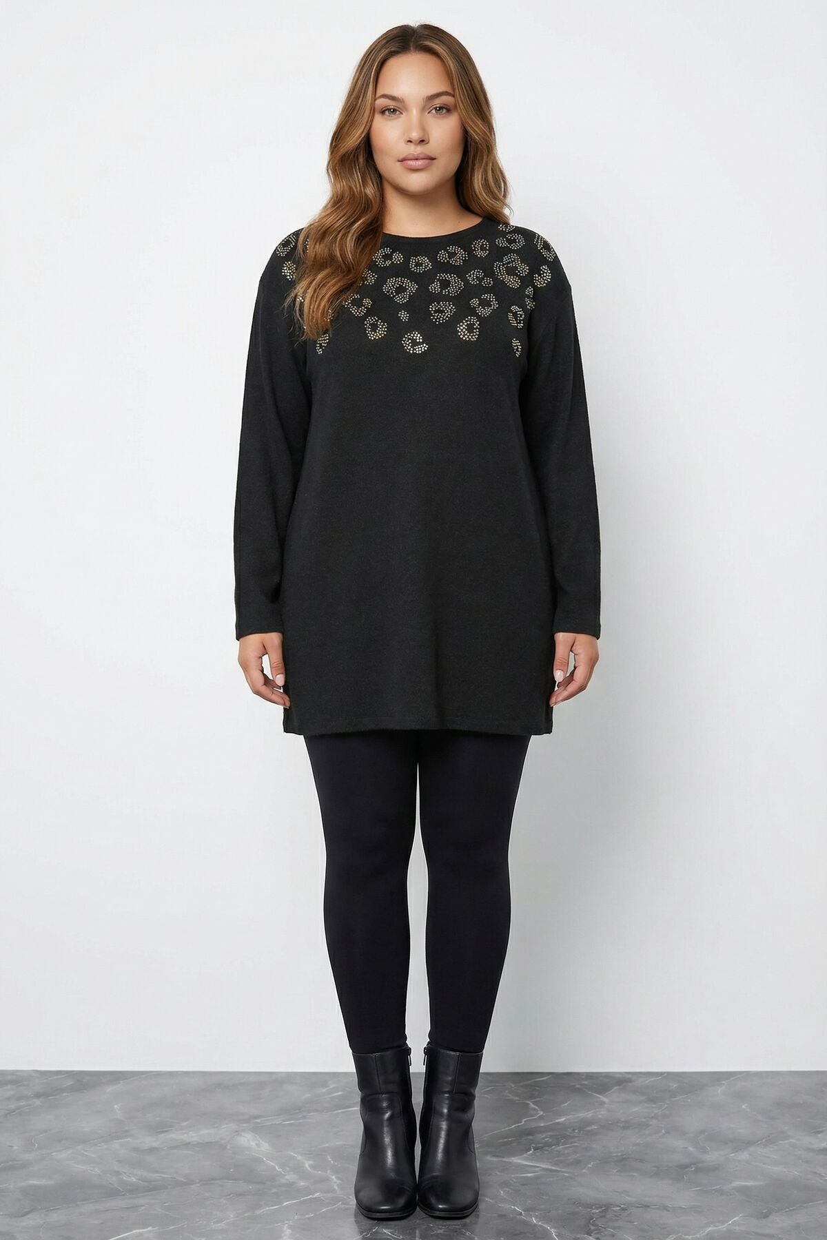 Büyük Beden Yumoş Dokulu Siyah Taşlı Tunik Kazak 520926