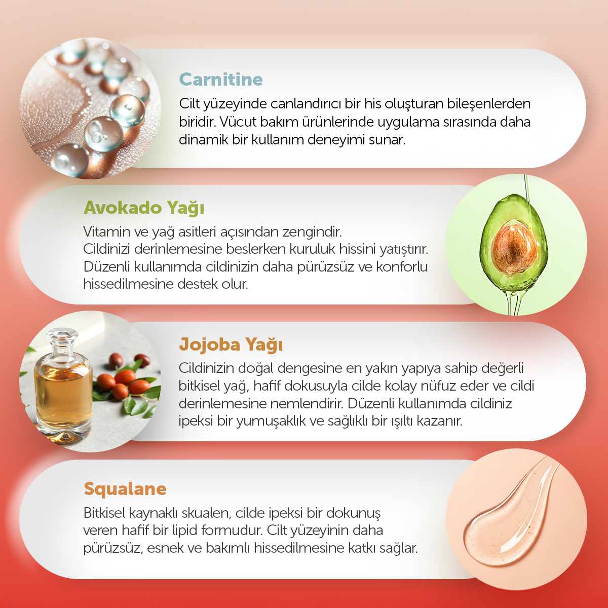 Formülündeki Sarcoslim Re-Shape, IsoSlim Complex ve Shape Perfection, portakal kabuğu görünümünün bakımına yardımcı olur, cilt elastikiyetini destekler ve daha gergin bir his oluşturur. Pentavitin ve Gliserin, cildin uzun süre nemli ve yumuşak hissedilmesine katkı sağlar. Guarana Ekstresi, Avokado yağı, Jojoba yağı ve Skualen ise cilde canlılık verir, besleyici bir bakım sunar ve cilt yüzeyinin daha pürüzsüz hissedilmesine destek olur.